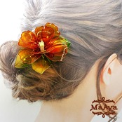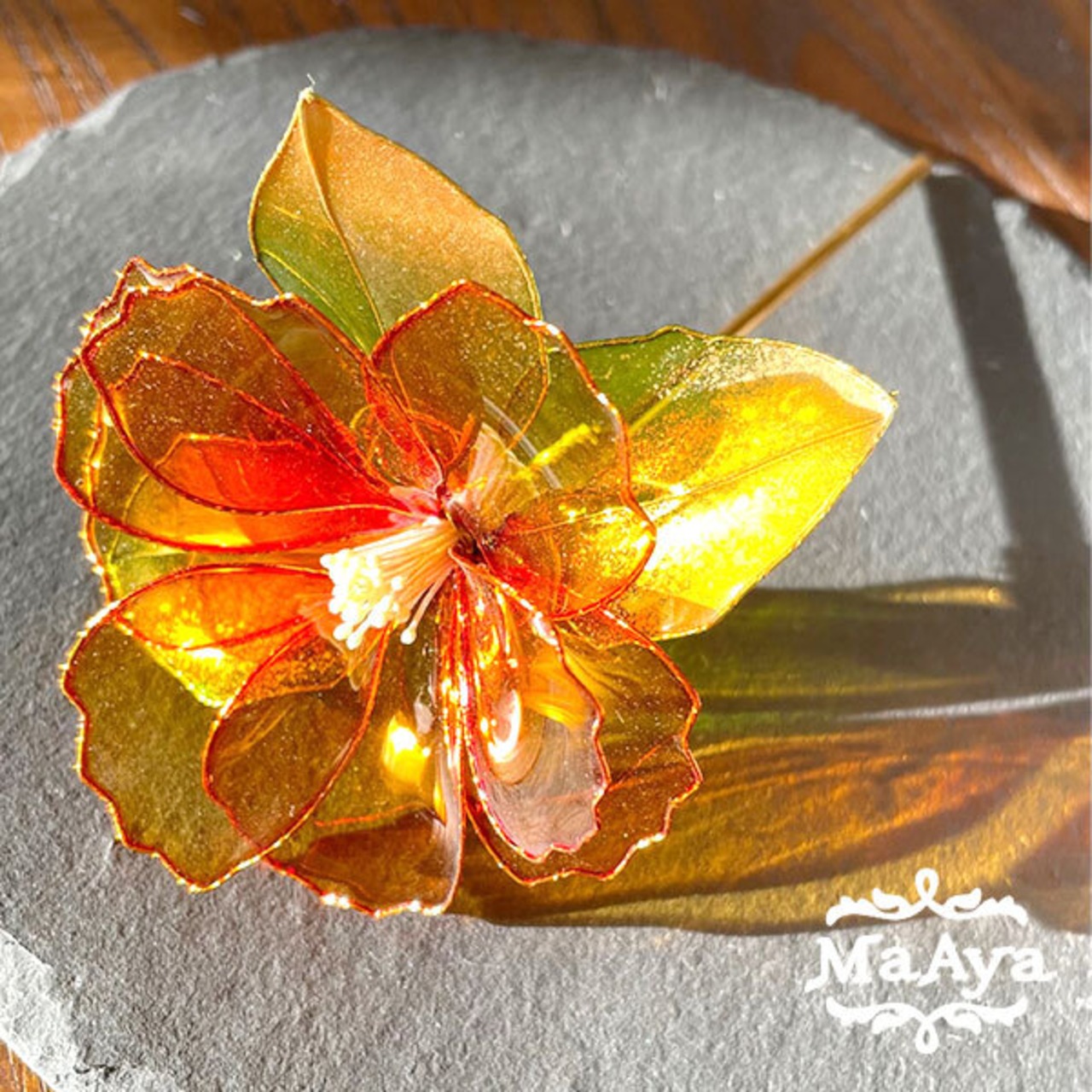 飴細工のような透け感と照り感がきれいな椿のかんざしです。