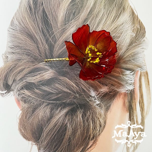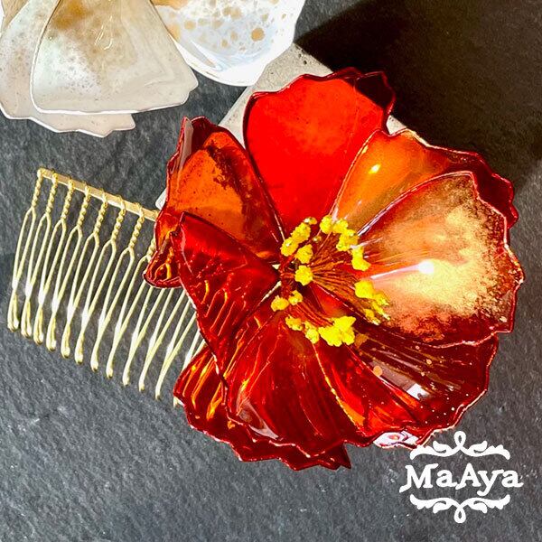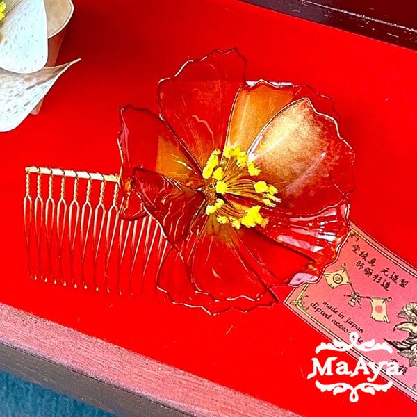 金衣・赤椿の髪飾り(ヘアコーム・ディップアート)【MA-194】